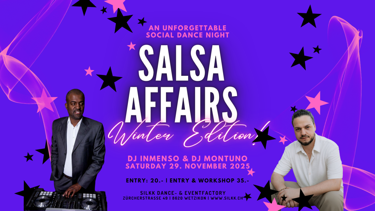 Unser Label SALSA AFFAIRS bietet dir in einmaliger Atmosphäre alles was das Social Dance Herz begehrt. Als Warm Up findet vor der Party ein Workshop statt und danach ist tanzen, tanzen, tanzen zu feinstem Salsa und Bachata von DJ Montuno und weiteren bekannten nationalen und internationalen Top DJ's angesagt.